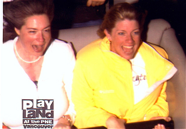 Melanie and Linda on the wooden roller coaster at the Vancouver PNE. Mel said she laughed the whole ride! (see also at Silverwood)
