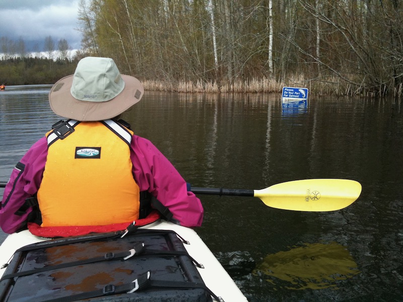 The river starts at the north end of Lake Sammamish, and passes over a weir that prevents the lake from dropping too much in the summer. However, at the time of our trip the river was at spring melt flood stage - notice the submerged sign. :-)